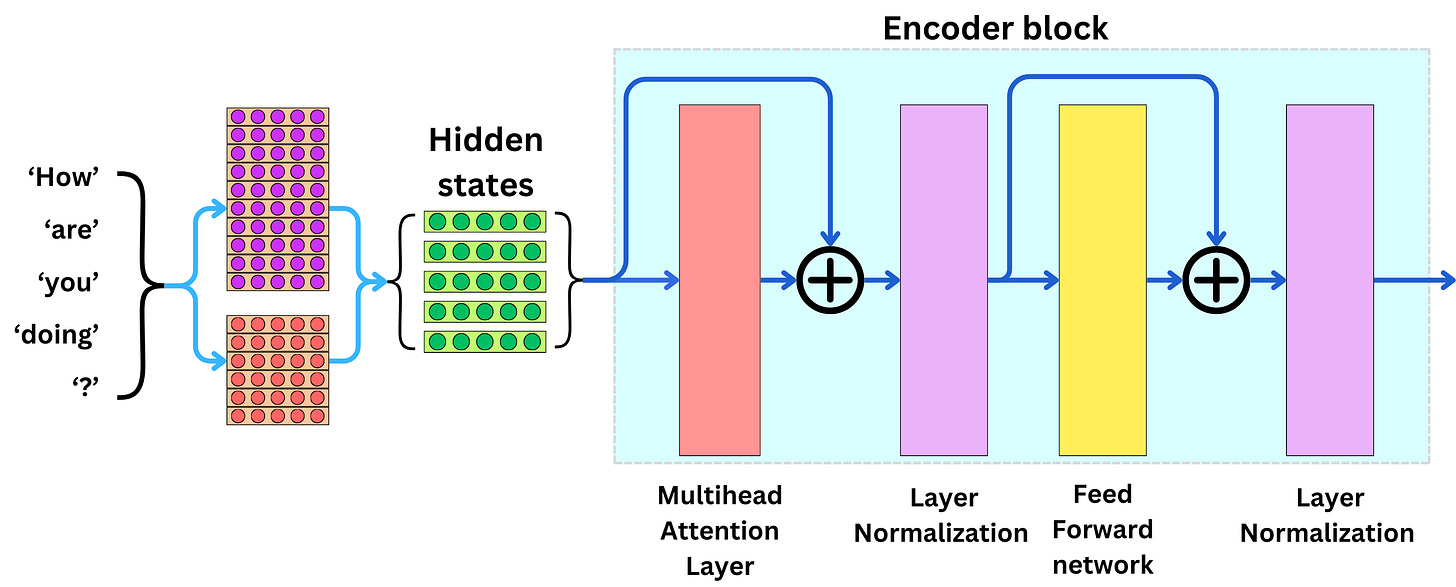 The encoder is just the token embedding and the position embedding followed by multiple encoder blocks.